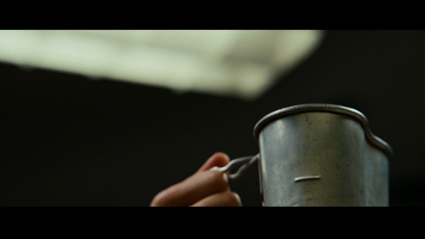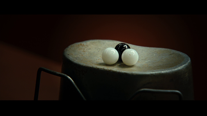 As we cut back and forth to additional title cards, a story slowly emerges in stroboscopic increments. A hand places the marbles in the cup and holds it aloft. Another reaches up and takes one.