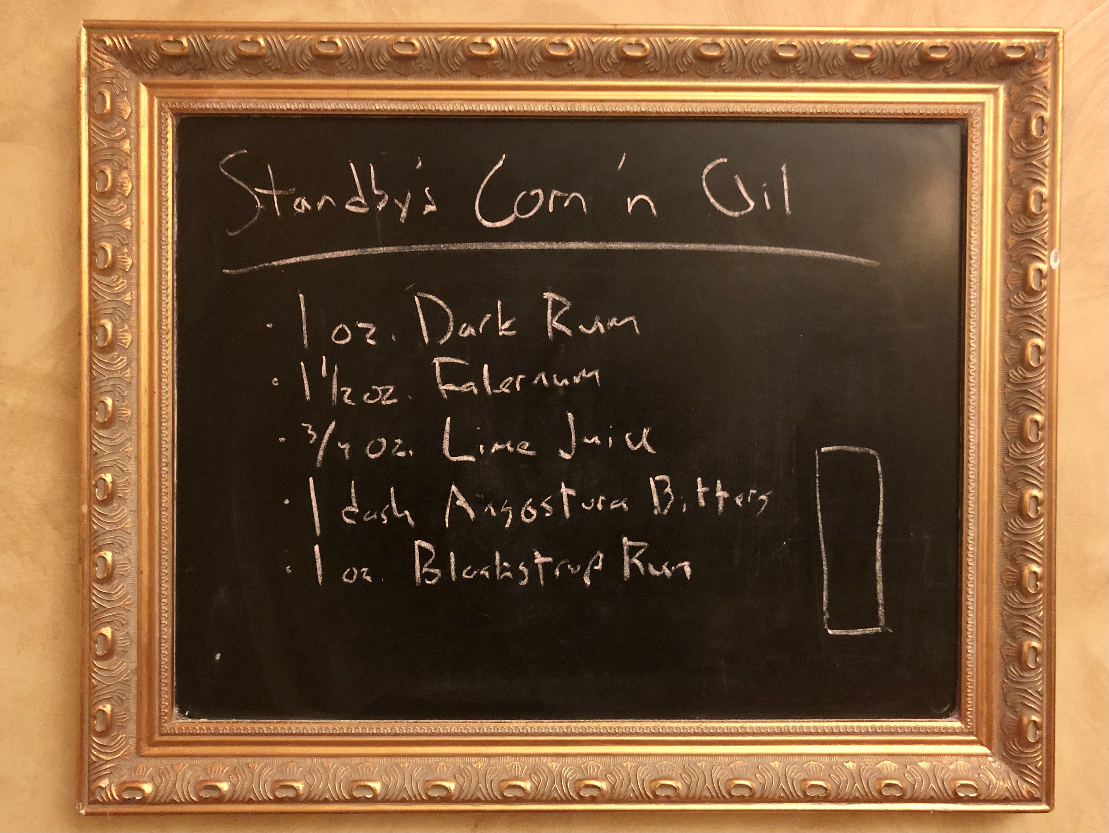 If you’re standing in my house, odds are you know that I love cocktails and that I don’t need much prompting to offer you one. This board, which I update once a month or so, is an invitation to ask me to do so and an order suggestion based on the spirits, syrups, and juices we have on hand. Currently it features a Corn ‘n Oil recipe from the Detroit cocktail bar Standby published by Imbibe Magazine a few years ago. This drink is the best application I’ve found for the Maggie’s Farm Falernum Liquor (made by a distillery located in my old stomping grounds of Pittsburgh) my loving wife got me for my birthday last year and a fine use for the bottle of Cruzan Black Strap Rum I always seem to have in my liquor cabinet as well. The clove notes in the falernum also create a bridge to the recently expired holiday season, while the tropical flavors are just the ticket for a brief respite from the cold of early January in upstate New York.