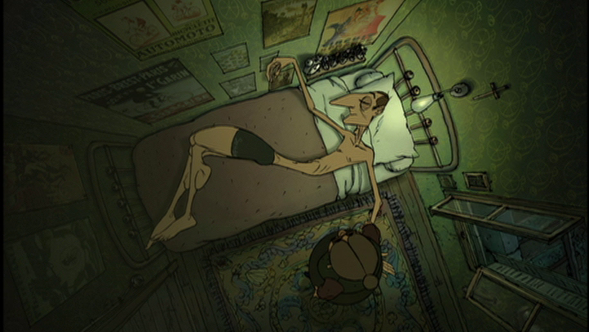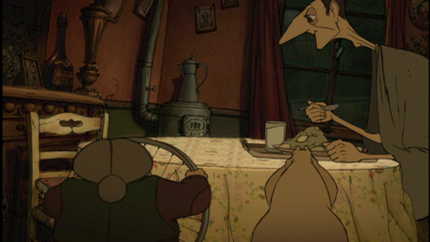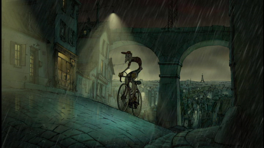 Following a brief glimpse of Bruno’s dreams, we are next transported to a Tour de France mountain stage. Madame Souza tracks Champion’s progress from the broom wagon (so named because it follows the race and “sweeps up” riders who aren’t able to finish in the time allotted) using binoculars: