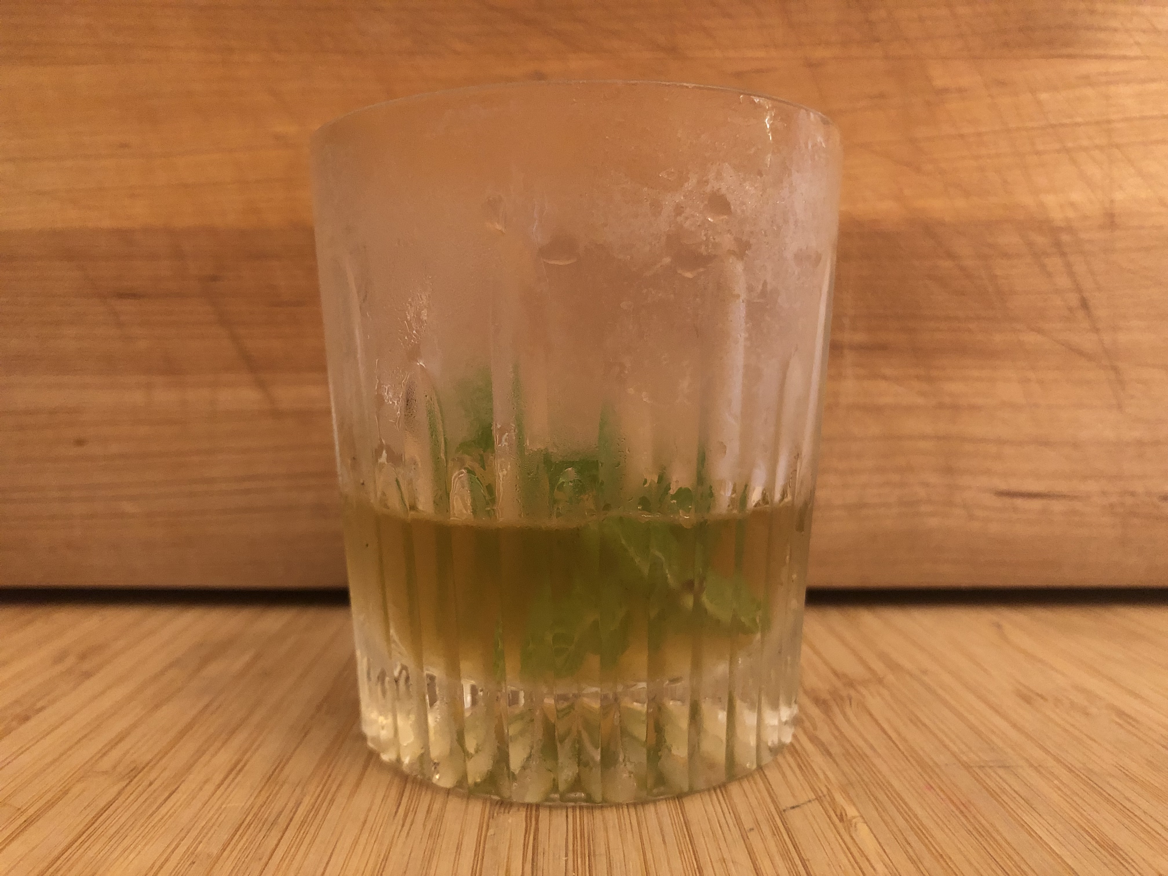 Muddle mint and sugar in a cocktail shaker. Add spirits and stir to combine. Strain into a chilled rocks glass and garnish with one nice-looking sprig of mint.