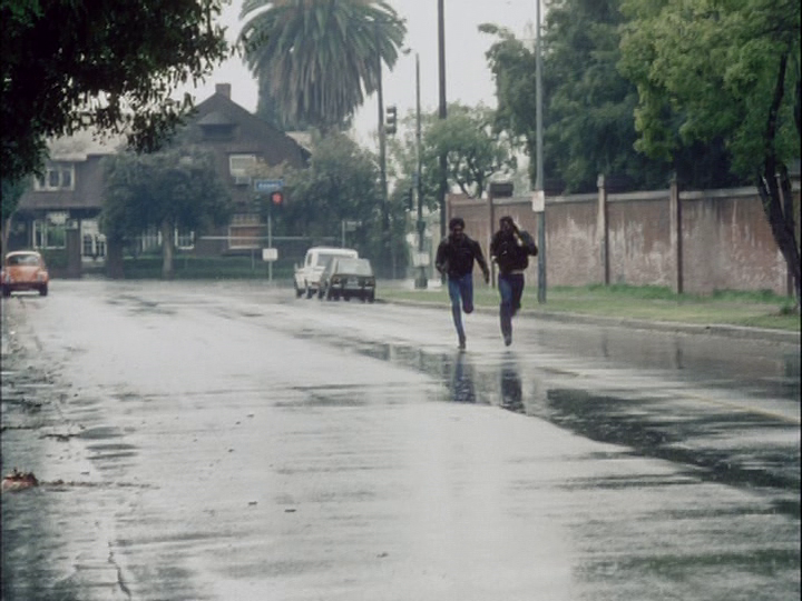 Finally, in my favorite running scene of all, Pierce and Soldier don’t just chase a would-be assassin (Garnett Hargrave) through the streets, they hurl themselves after him with utter disregard for their bodies or the law of gravity, skidding across and careening off features of the urban landscape:
