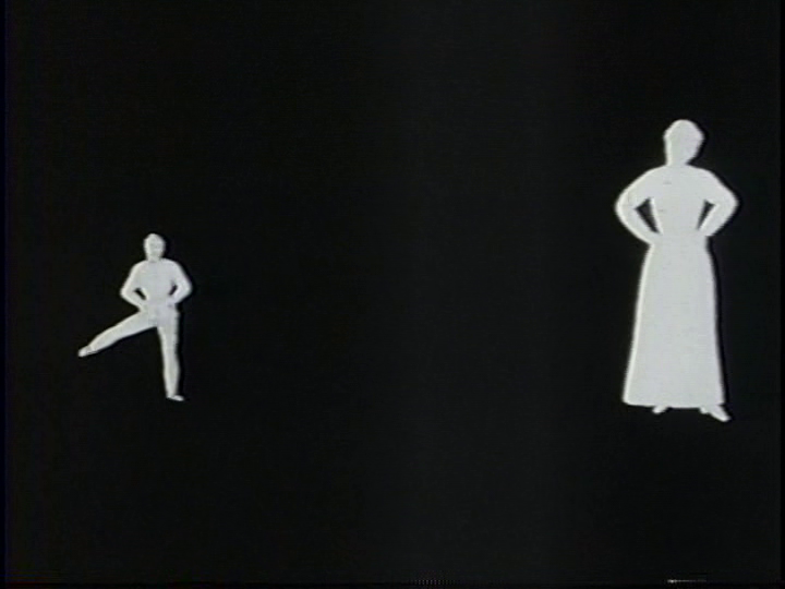 The Very Eye of Night is similar to Heaven and Earth Magic in that it has an elaborate story that can probably only be followed by viewers who know what to look for. As described by scholar Sarah Keller in her book Maya Deren: Incomplete Control, it begins with an elaborate credit sequence which introduces the characters and “upholds the philosophical, mythical, and/or metaphysical principles espoused by the film as a whole,” as in the case of this image which references an eye with an iris, the yin-and-yang symbol, and Leonardo da Vinci’s “Vitruvian Man”: