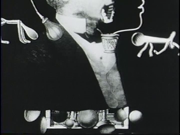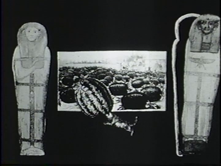 This narrative absolutely is discernable upon repeat viewings, and Heaven and Earth Magic easily lends itself to a variety of interpretations as well. Scholar Noël Carroll, for instance, reads it as a “mimesis of the drug experience” and a “metaphor of cinema as mind.” The viewer does need to put some effort into it, though, which lends credence to Sitney’s claim that Heaven and Earth Magic is Harry Smith’s “most ambitious and difficult work.” Whether or not you enjoy this film is utterly dependent on how interesting you find its images and musique concrète score. Apparently Smith preferred an original cut which was more than four times as long, but I think it’s just about perfect at 66 minutes. The use of what Carroll calls “literalization” is consistently surprising and hilarious, such as when the theft of the watermelon is accompanied by the sound of water: