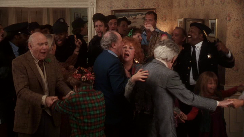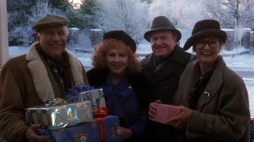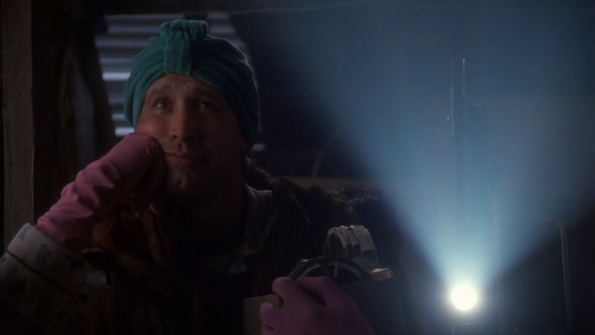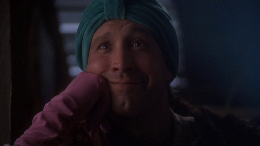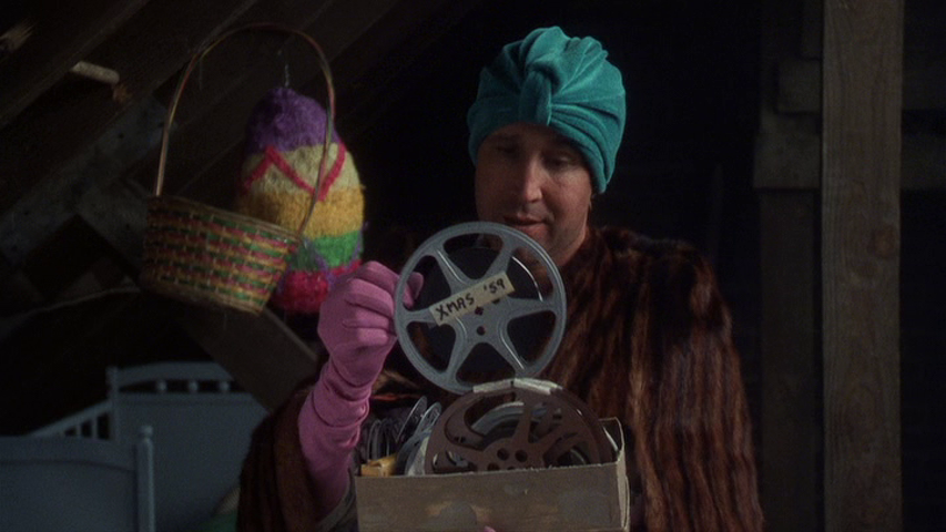 Considered against the entire sweep of film history, Chechik and crew aren’t doing anything original in this scene, but it stands out within the realm of holiday movies because it finds a perfect balance between sentimentality and slapstick. The pratfall at the end of this scene is funny because it’s surprising: we know something is coming, but not what, since we have no way of knowing that Clark set his projector up right on top of the attic door. Meanwhile, the 2:1 (after the initial tracking shot) ratio of documentary evidence of what the “fun, old-fashioned family Christmas” that he’s trying to recreate looked like to his emotional responses to it helps us understand what he’s struggling to achieve elsewhere in the film and why. Last but not least, the marriage of these images to Ray Charles’s “That Spirit of Christmas” is absolutely perfect.