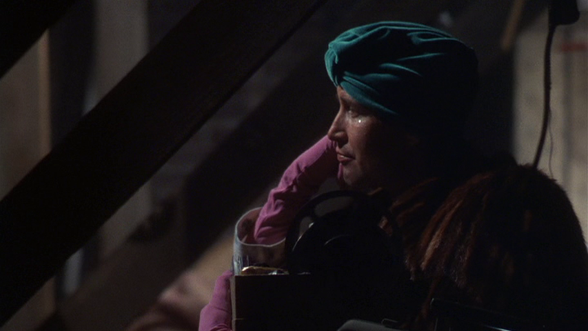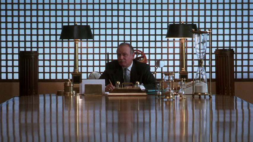 The scene which follows is a smidge under two minutes long and begins with a 37-second lateral tracking shot which brings Clark into the right third of the frame with a film projector in the foreground: