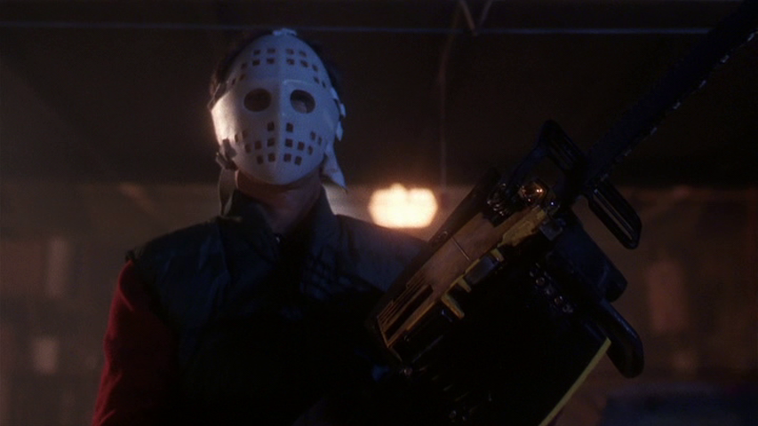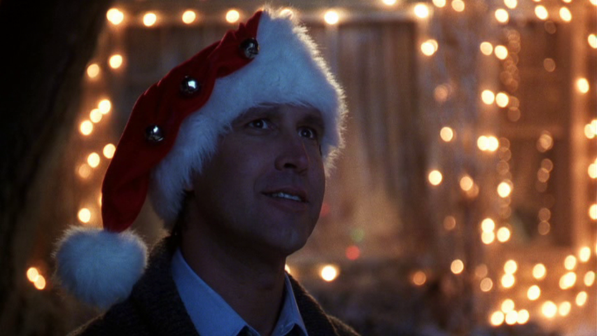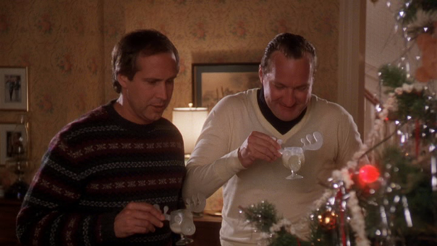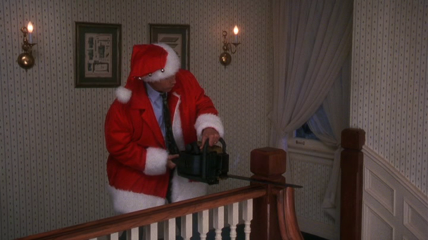 Which, per Wilmington, “fuses imagery from ‘It’s a Wonderful Life’ and ‘The Texas Chain Saw Massacre’ in a single visual gag,” a connection we are prepared to make by an earlier scene in which Clark dons a hockey match before cutting his tree down to size: