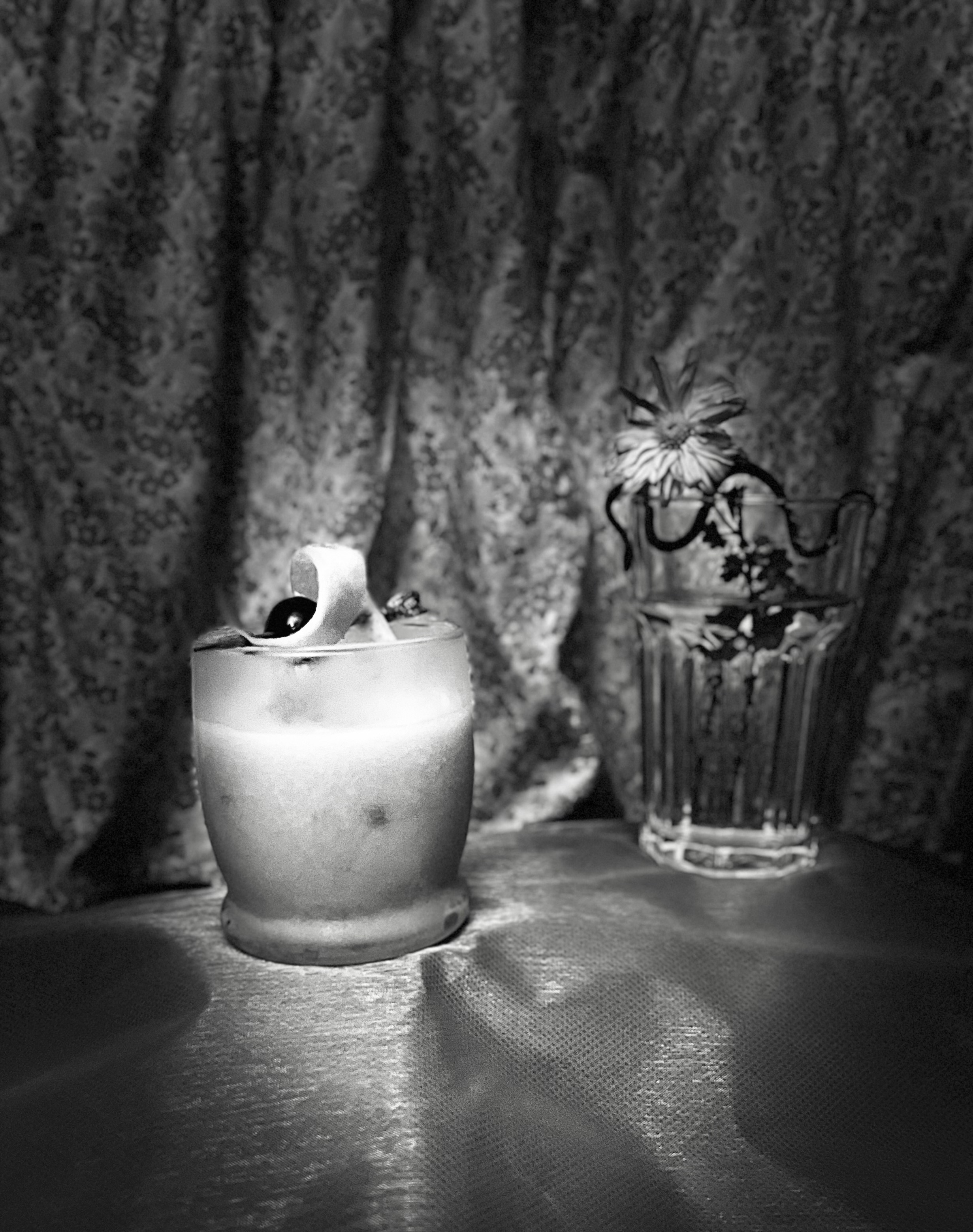 Dry shake all ingredients, then add ice and shake again. Strain into a chilled rocks glass with one big ice cube, making sure to get as much froth out of the shaker as you can, and garish with a cherry and a lemon twist.