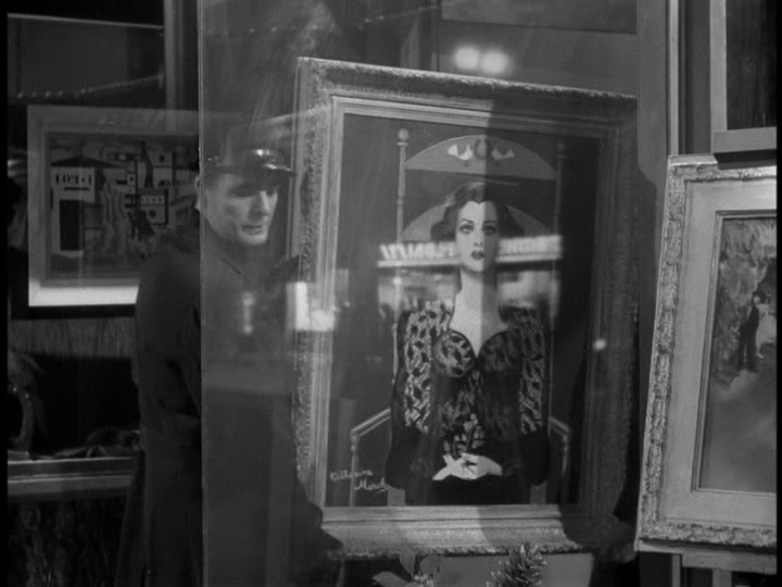 The soundtrack then shifts to “Melancholy Baby,” which is utilized throughout the film in a variety of versions for a wide range of purposes. One way to look at this is as simply a logical accompaniment to the painting which two men are carrying out of the gallery he’s passing by, which is of course his/Kitty March’s aforementioned “Self-Portrait.”
