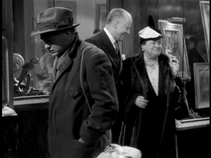 Wow! The soundtrack then shifts back to a Christmas carol, this time “Jingle Bells.” There is, again, an obvious explanation: the gallery owner Dellarowe (Arthur Loft) is saying to his customer (Constance Purdy), “well, there goes her masterpiece. I really hate to part with it.” To which she replies, “for ten thousand dollars, I shouldn’t think you’d mind!” So the jingling bells are those of the cash register.