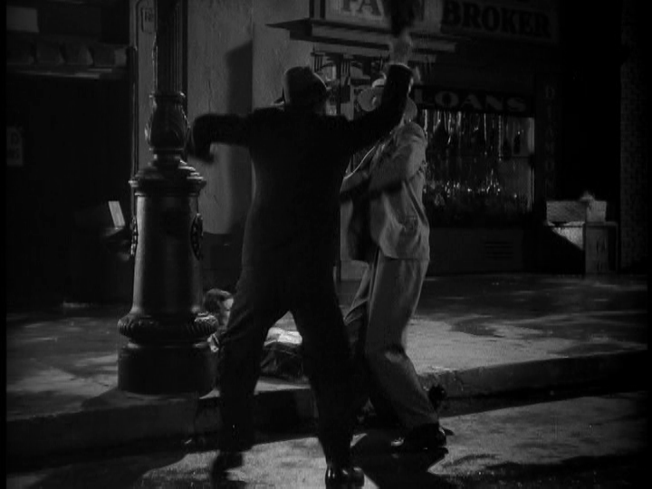 Then checks on her assailant. Chris runs off to find a policeman. When they return, the man is gone. The woman, whose name we will soon learn is Kitty March, tells the cop he went thataway, then says to Chris, “let’s get out of here.” He consents to take her home, and with that his fate is sealed. We are barely ten minutes into a film with a runtime of 102.