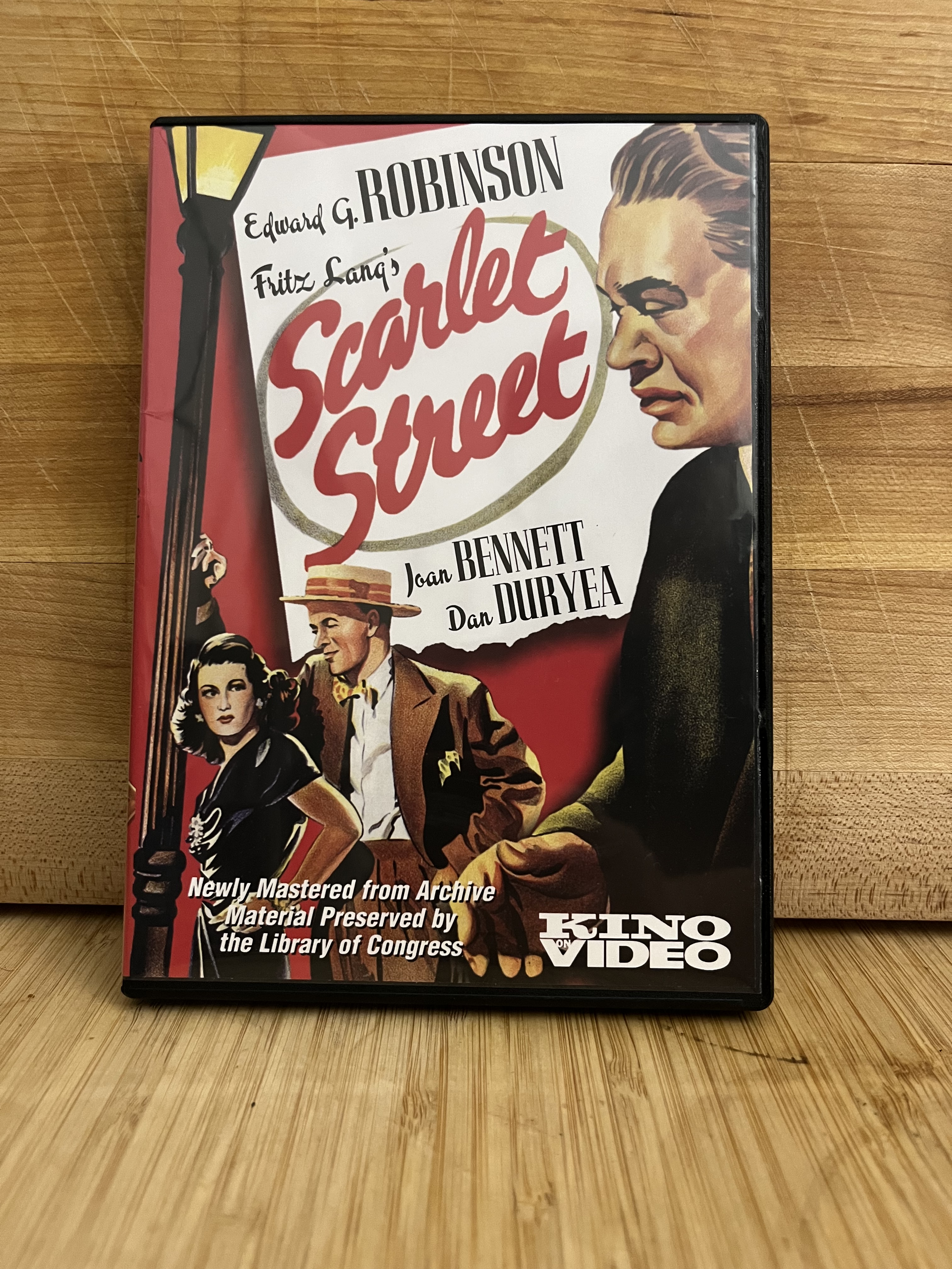 My go-to bourbon for this drink is Maker’s Mark Cask Strength, but they make the spirit I featured in last month’s aged eggnog and I wanted to mix things up a bit. I’m glad I did: 1792 is just about as good of a value and contributes an even higher ABV, which is essential for cutting the sweetness of the amaretto and creating the “warm glowing warming glow” I’m looking for in the dead of winter. It results in a richer texture as well, and you definitely want to use 2:1 simple syrup for the same reason. Disaronno is delicious and easy to find and also has a great origin story: according to the company’s website, the woman the artist Bernardino Luini (a pupil of Leonardo di Vinci) chose as a model for the Madonna in one of his frescoes created it as a thank you gift. And so it was that this month’s pairing suggested itself, because when I think about painting and the winter holidays, one movie immediately springs to mind: Scarlet Street, which ends with perhaps the most cynical use of Christmas music in the history of cinema. Here’s a picture of my Kino Video DVD release: