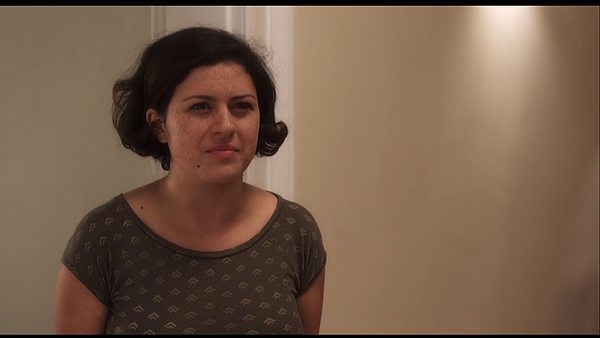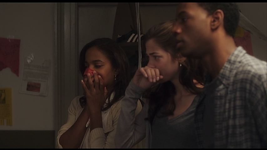 Lily has lost her housing assignment, though, and when her three new friends offer to let her room with them, she gratefully accepts. We follow the new quartet to the suicide prevention center they run through which they meet the temporary fifth member of the their group pictured on the DVD case, Caitlin Fitzgerald’s Priss, along with Nick Blaemire and Aubrey Plaza in memorable cameo roles as Freak Astaire and Depressed Debbie respectively, all three of whom can be seen in the screengrab below rehearsing a show that the center is putting on for therapeutic reasons: