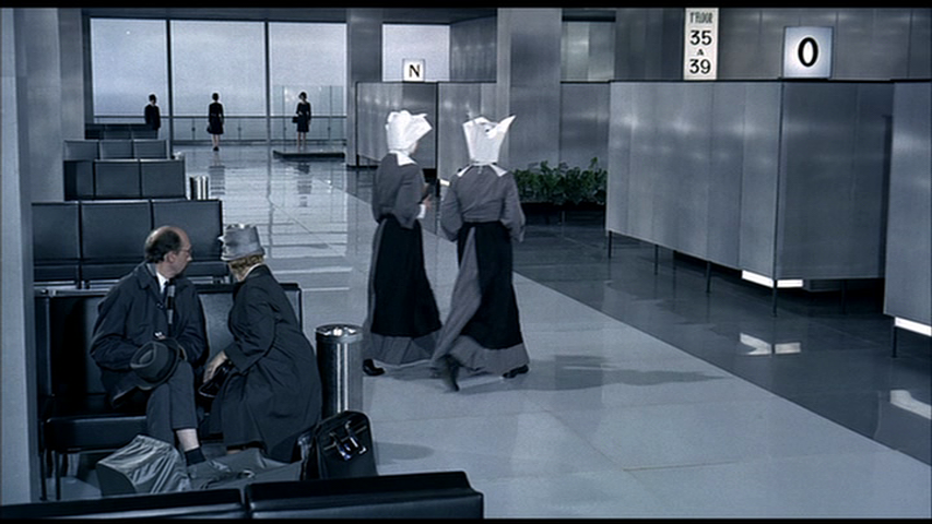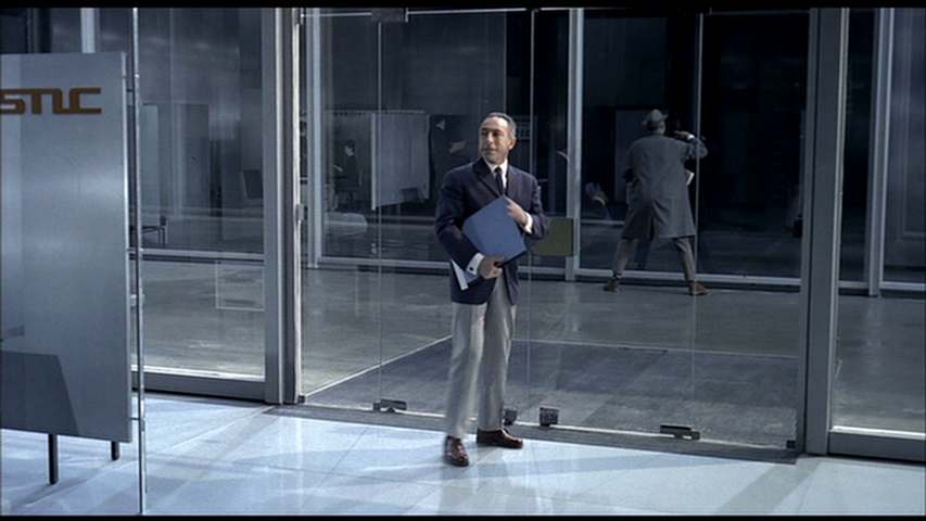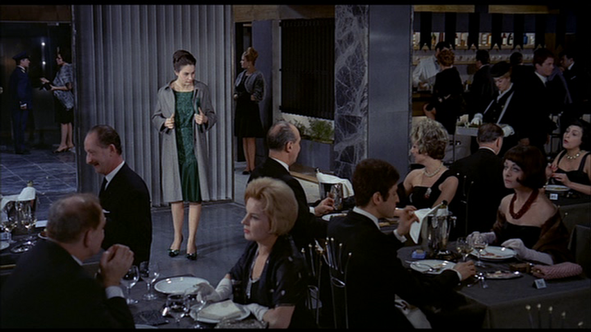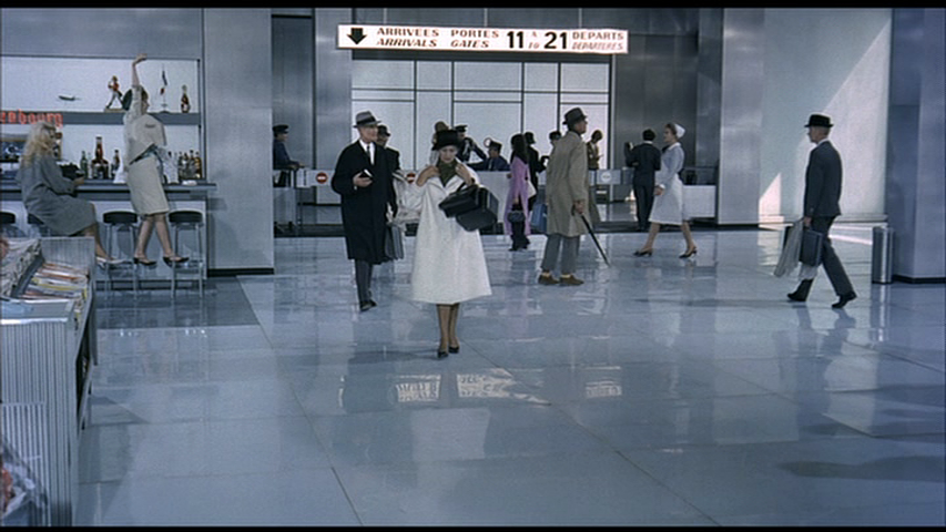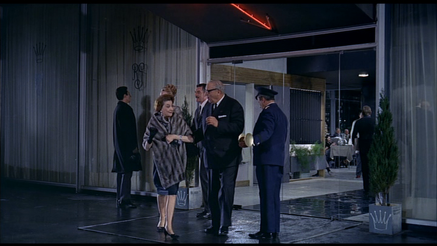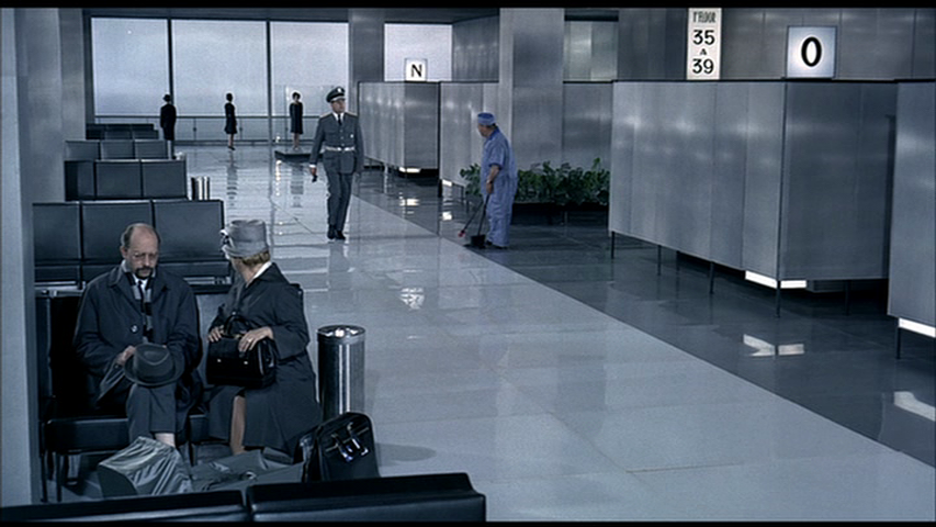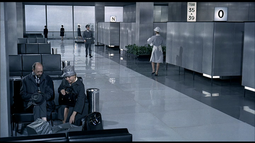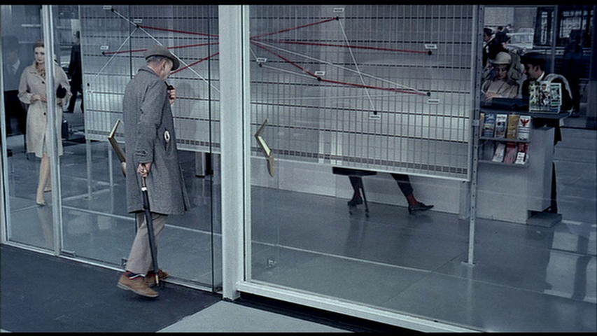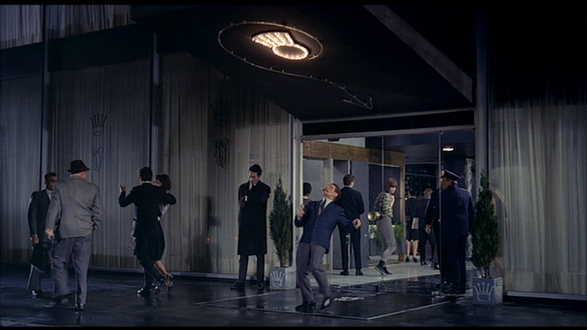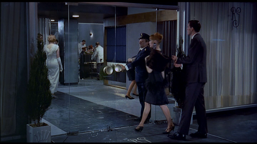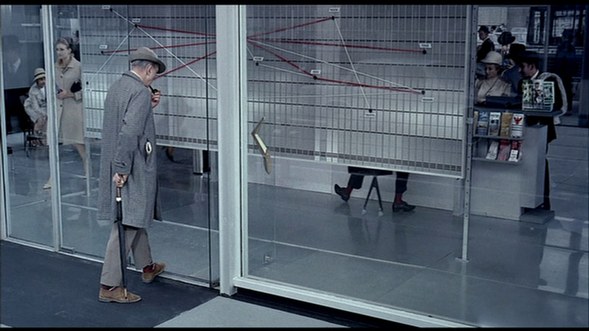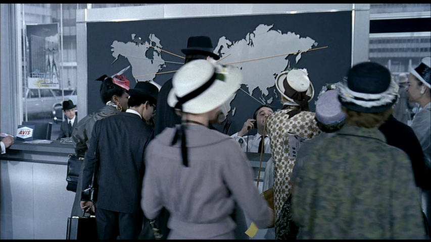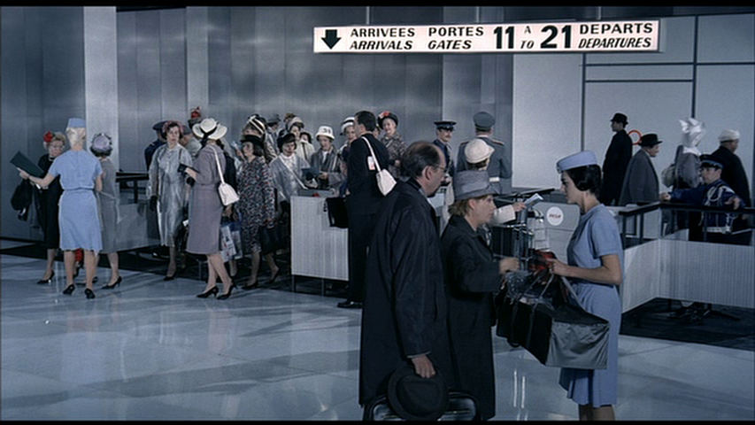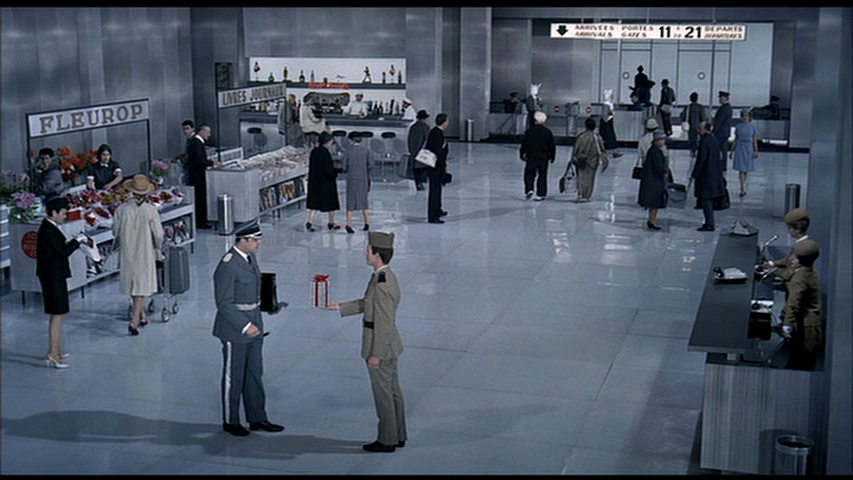 This is just the first of many instances of what Lucy Fischer (who was chair of the film studies department at Pitt when I was a student there) calls “one of the major functions of Tati’s remarkable soundtracks” in a Sight & Sound article called “‘Beyond Freedom & Dignity’: An Analysis of Jacques Tati’s Playtime“–the way they “provide aural cues to guide our visual perception.” As Fischer notes, he uses color the same way, beginning with the elaborate presentation of a gift which we pick out from a crowded monochrome mise-en-scène in large part because of its bright red bow: