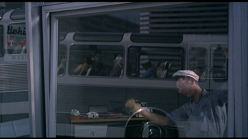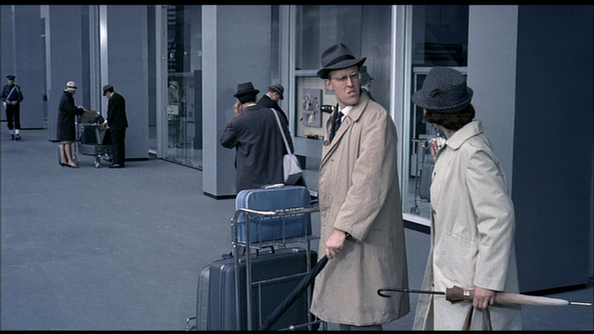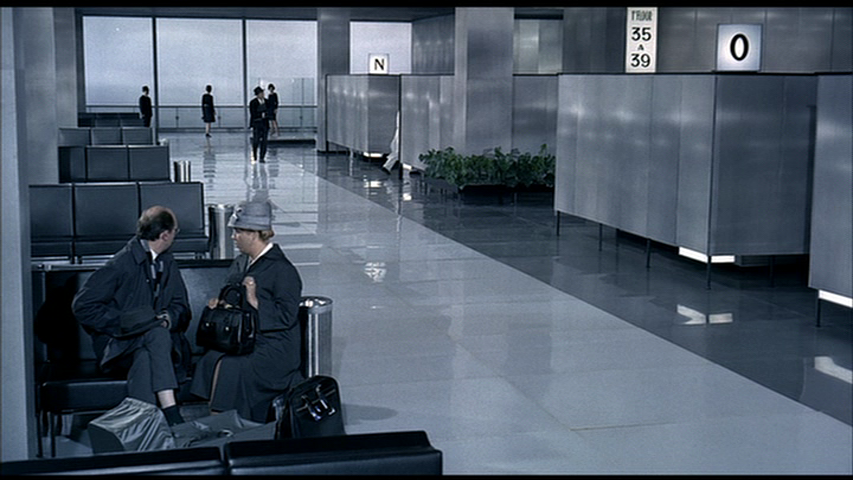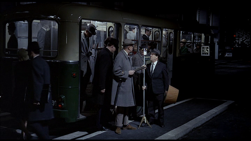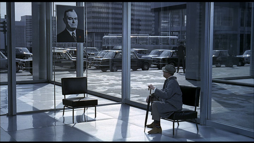 The gap to the three set pieces that are the reason Playtime rates as one of cinema’s all-time great comedies in my book is bridged by a transition featuring a nice bit of business whereby Hulot holds onto a lamp thinking it’s part of the bus he’s riding: