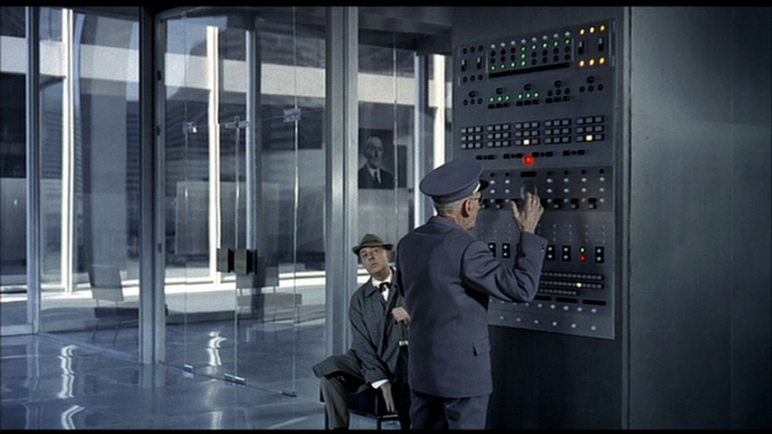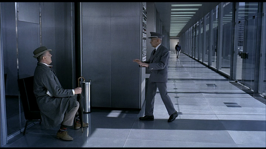 It’s unclear (and completely irrelevant) what Hulot is doing at the airport, but we next encounter him making his way to an appointment in another modern high-rise, where he is announced via the most over-engineered intercom system on this side of Toontown: