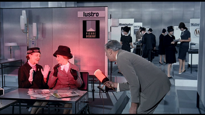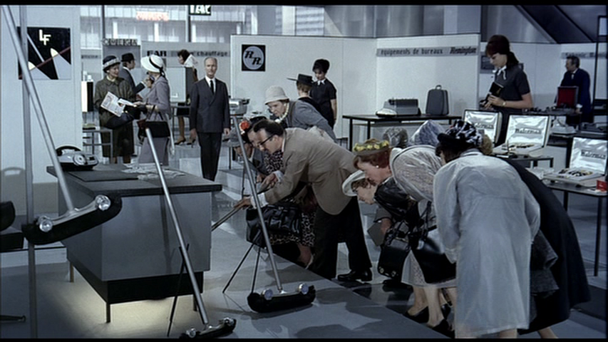 The next 20 minutes or so of the film unfold during a business exposition that both Hulot and the Americans from the airport find themselves attending, him by accident and them on purpose. One tourist named Barbara (Barbara Dennek) pursues an illusive “real Paris” that she’s only able to glimpse in reflections while her companions ooh and aah over a broom with headlights: