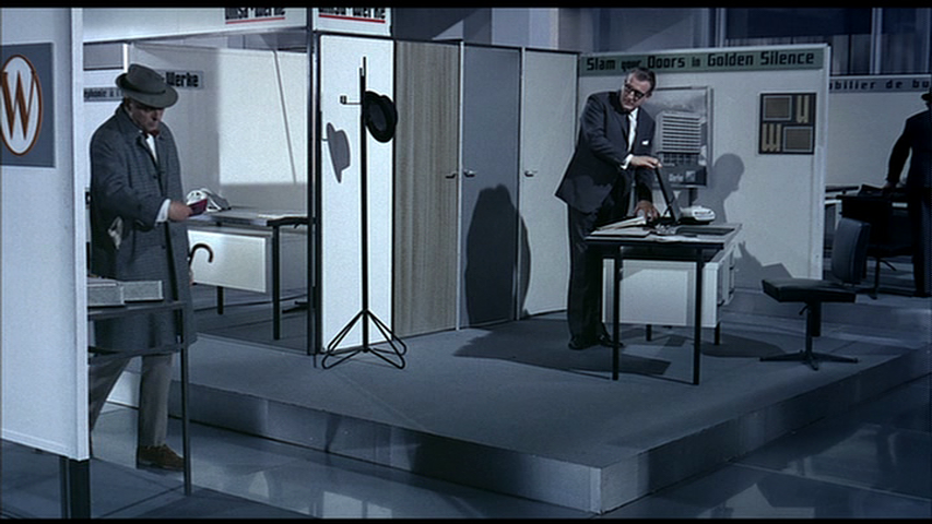 Meanwhile, Hulot is mistaken (due to confusion with another false Hulot) for first a corporate spy by a German businessman whose company’s motto is “Slam your Doors in Golden Silence,” then a lamp salesman when he loses his trademark outerwear: