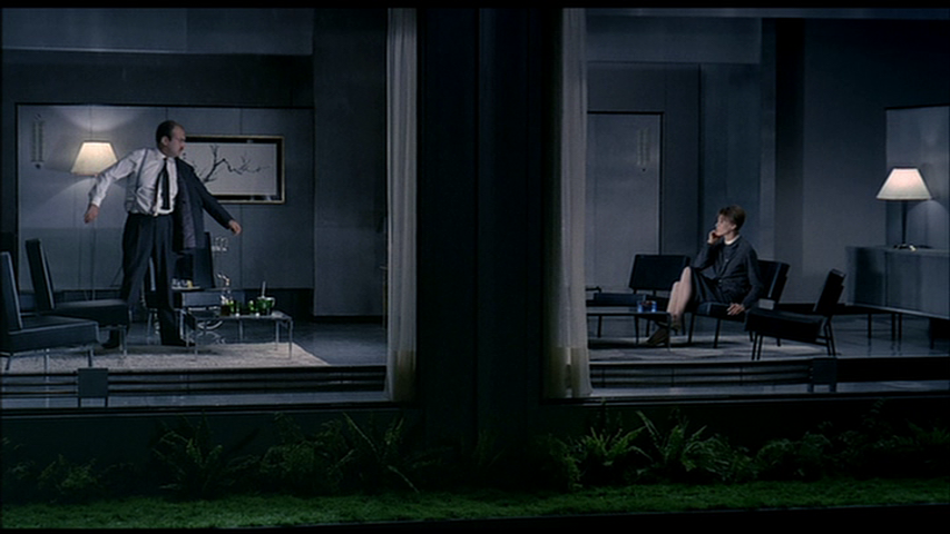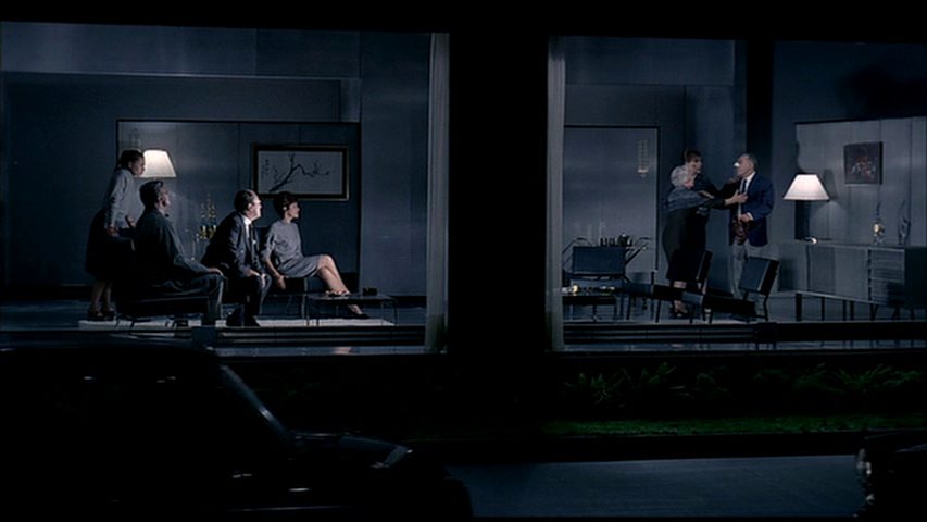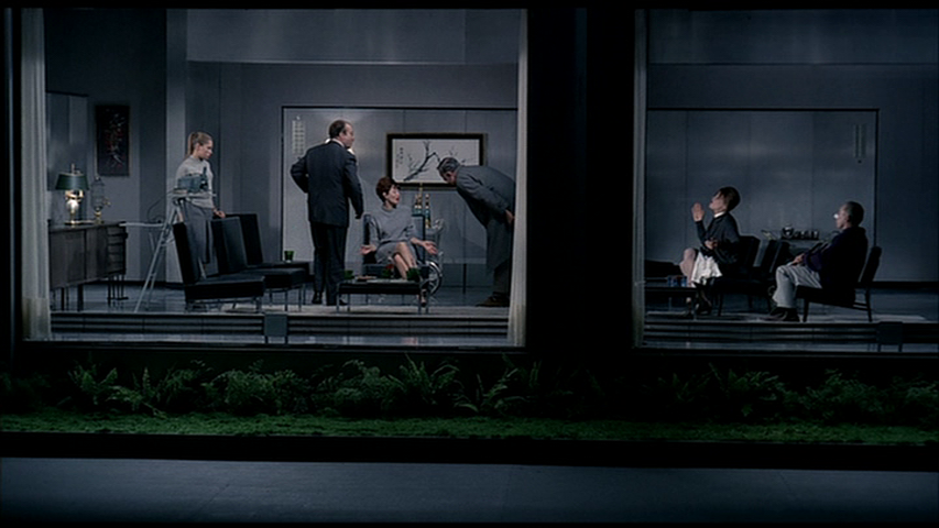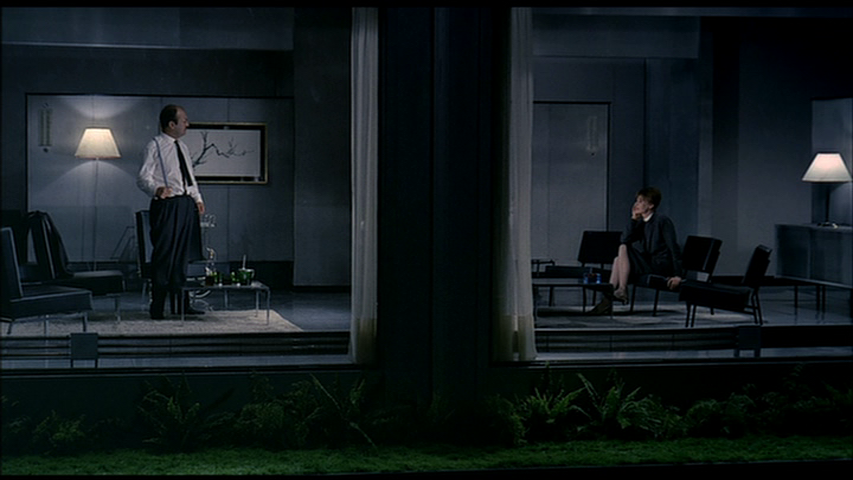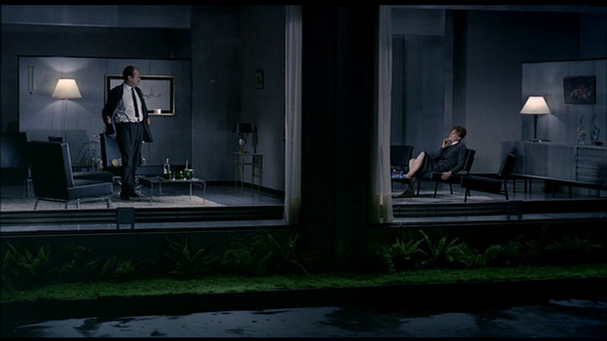 We view everything that transpires over the subsequent ten minutes from this same outside view, and when the camera pulls back to also show the neighbors’ living room as well, characters who can’t really see each other seem to be interacting. The apartment next door turns out to belong to Giffard, and the Schneiders and Hulot appear to stare in surprise when he comes inside with a bandaged nose: