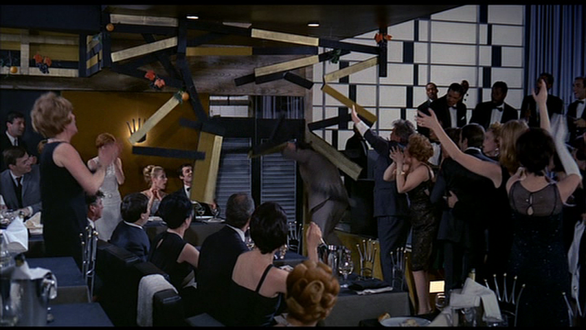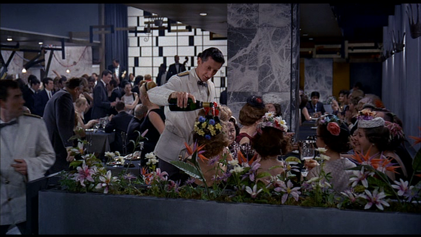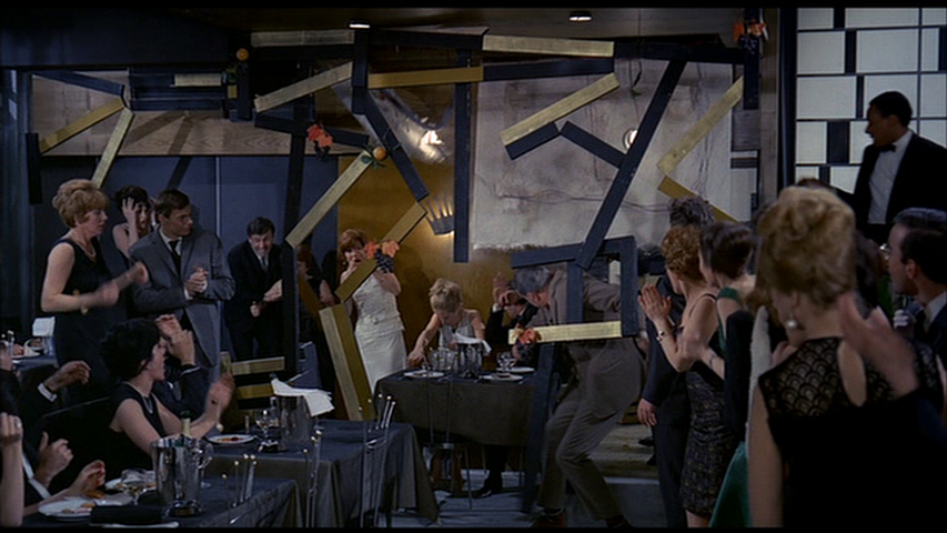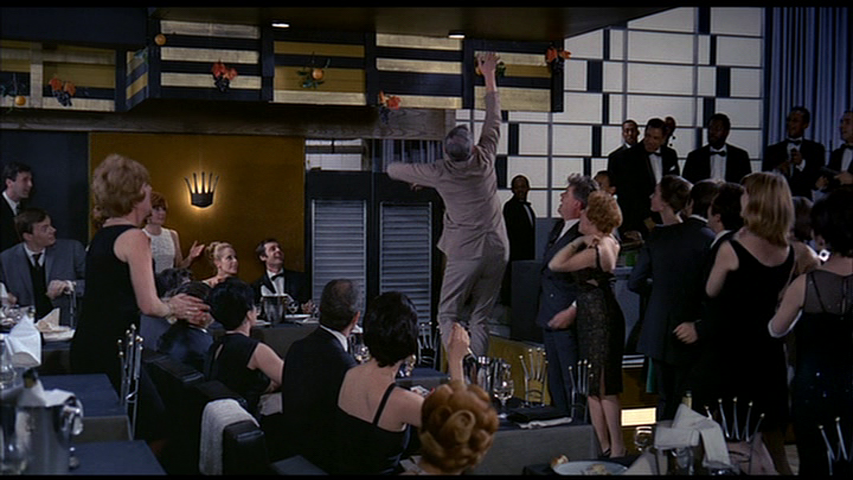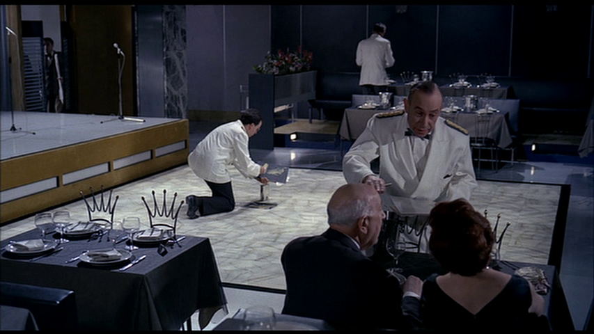Before finding himself at the soft opening of an establishment called the Royal Garden at the invitation of the doorman (Tony Andal), another friend from his military days. Of course, this tour-de-force, nearly hour-long sequence has been going on for twenty minutes by the time he arrives, which is about par for the course according to Malcom Turvey, who calculates in his book Play Time: Jacques Tati and Comedic Modernism that Hulot is on screen less than 50% of the movie up to this point. I’d need a whole separate post to do justice to the way the nightclub basically falls apart over the course of a single service to the delight of its guests, who have more and more fun as the evening spirals further and further out of control, but highlights include a waiter fixing a broken tile in the background while another pantomimes saucing a fish in the foreground using the exact same motions: