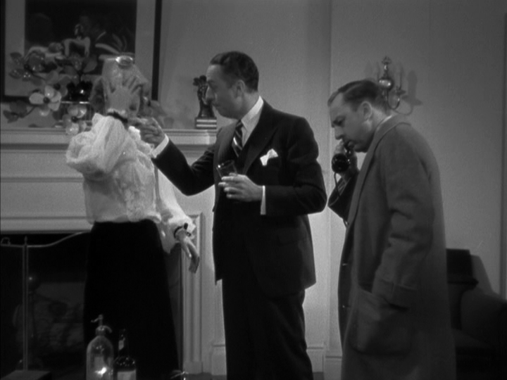 Martha Nochimson argues in her book Screen Couple Chemistry: The Power of 2 that The Thin Man “is not structured by Hollywood’s familiar gender formula: woman/body–man/mind.” She submits as evidence the fact that both Nick and Nora first appear from behind, him in the mixing ritual depicted above which “requires an atypical male absorption in his body,” while her entrance behind their dog Asta “uses the cliche of female closeness to animality and body to make a joke of Hollywood’s traditional images of female glamour”: