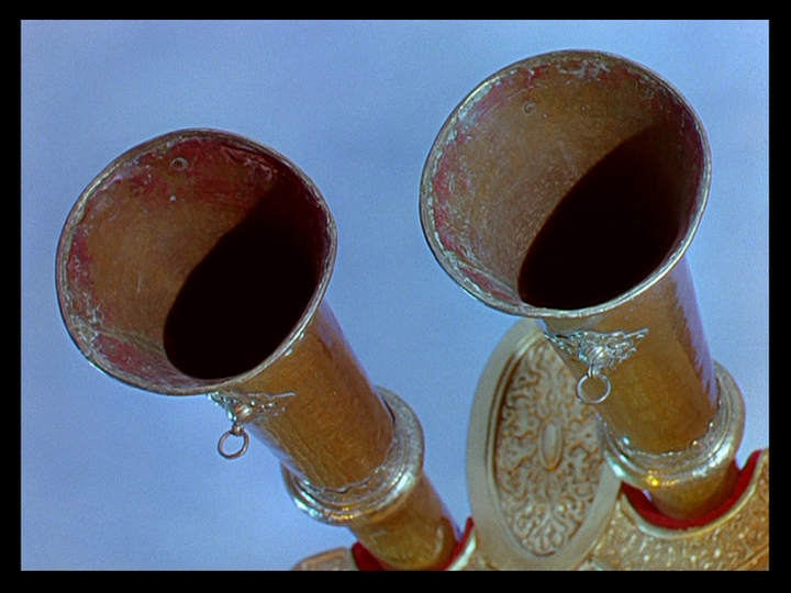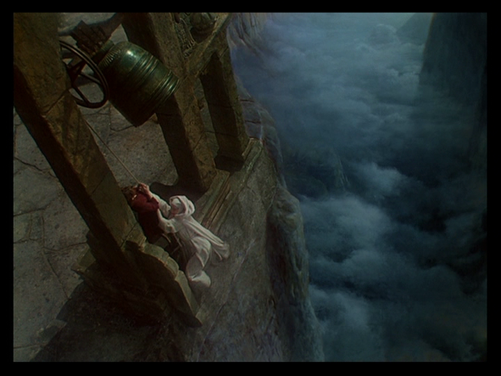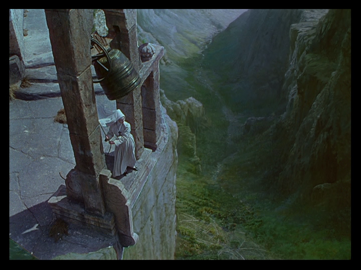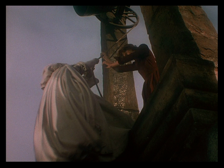 But she appears very soon afterward in corporeal form at Mopu ringing a bell perched at the end of a dizzying abyss which Bertrand Tavernier calls “absolutely breathtaking” in the DVD extra The Audacious Adventurer and an example of special effects that are more impressive than those of the digital era because “these seem to have a soul: they are not just the product of technology but are infused with emotion.”