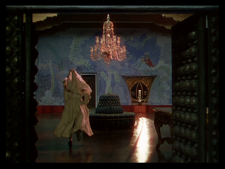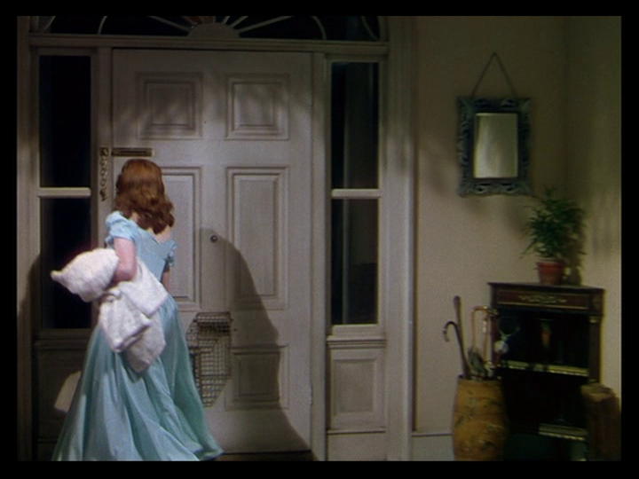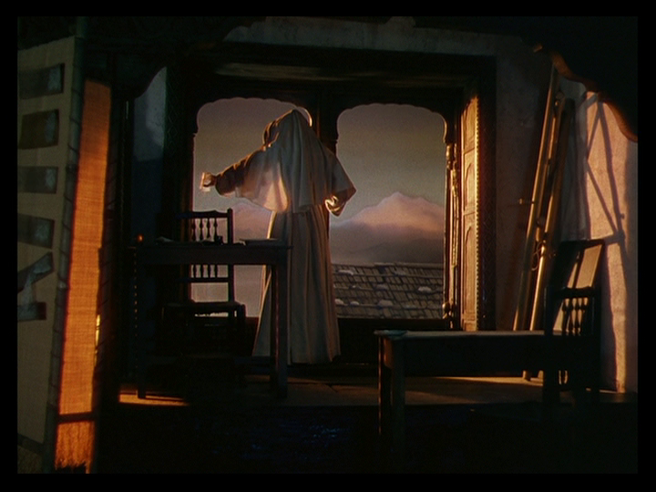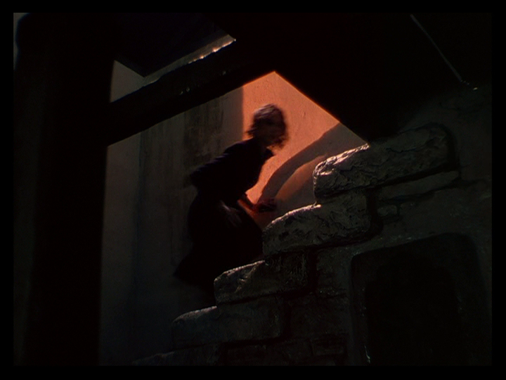 She rushes downstairs past a dramatic streak of sunlight on the floor that Kristin Thompson says in her video essay “Color Motifs in Black Narcissus“ Technicolor technicians lobbied Cardiff to remove from the film after they misidentified it as a lens flare: