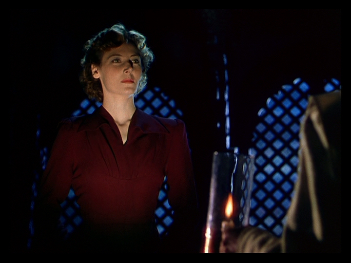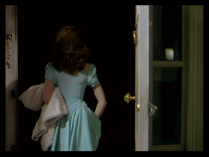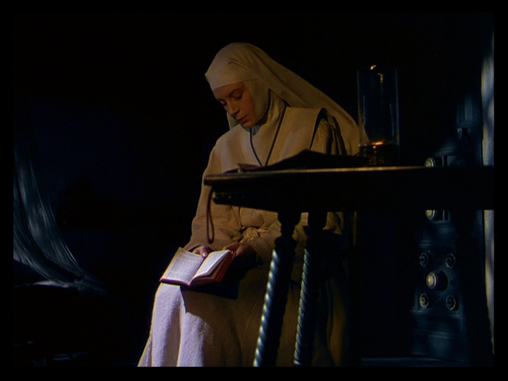 In his autobiography A Life in Movies, director Michael Powell describes the climax of Black Narcissus, which ensues after she comes to and returns to Mopu, as an experiment with “composed film” whereby the blocking and editing were timed to composer Brian Easdale’s music, as opposed to him creating this part of the score based on rushes. Reminiscent of a horror film, it begins with a two shot sequence of Sister Ruth watching Sister Clodagh intently in the predawn hours: