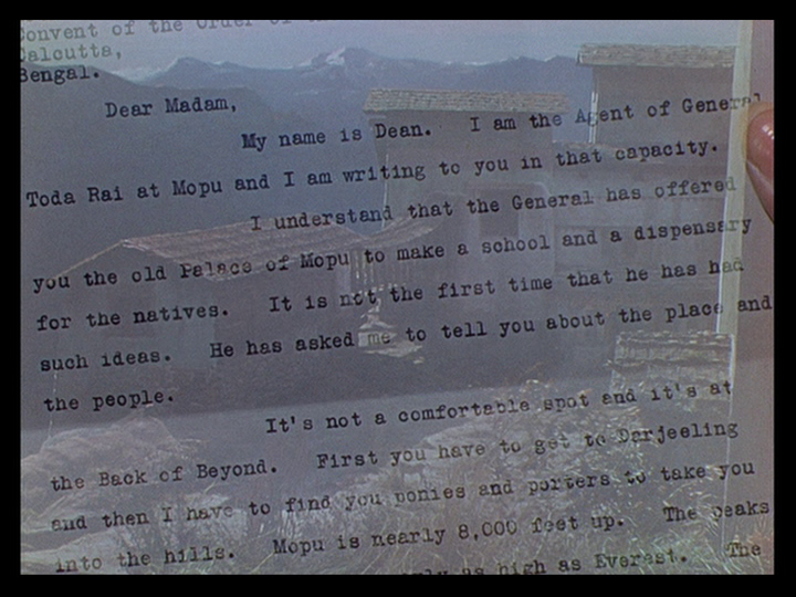 This is followed by an introduction to Mopu, which the Order of the Servants of Mary plans to convert into a convent, that Priya Jaikumar notes “is filtered through three people, all of whom are less than objective about the place and the nuns’ mission.” We see it first through the eyes of Reverend Mother Dorothea (Nancy Roberts), who ponders an illustration in a book: